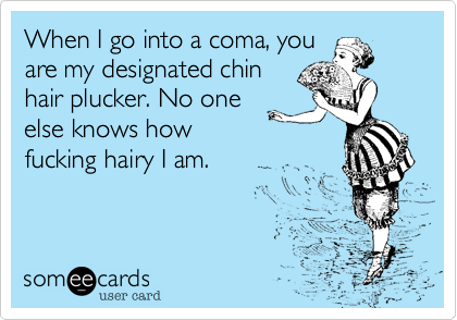 And so to the worst taboo of all: female facial hair. Long considered freakish, like the circus women of the past, it is in fact quite common, for some women more than others. Asian woman often have downy hair on their cheeks but remove it via threading. And it is not always a symptom of a hormonal imbalance, just bad luck. My mother had terrible facial hair and I have inherited this problem, although it seems my sisters haven’t, darn it. She had a fear of this being exposed and a request that she be shaved by us during any prolonged hospital stay, as below. The fact that this meme exists means she was not alone: