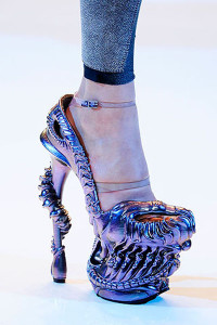 The shoes were another story. Some of them were objects of beauty that were fun to admire in a gallery setting, but to imagine they could ever be worn in a real woman’s life was impossible. There are those that do of course, but not to walk anywhere, or carry shopping, or children. Running for a bus would definitely be out. Standing might be okay, but only for a short time. Going back to the eroticism theme, some are definitely designed for sex or the initiation of it, but you might get tired of ripping your silk sheets on a regular basis, so even for that they have limited appeal.