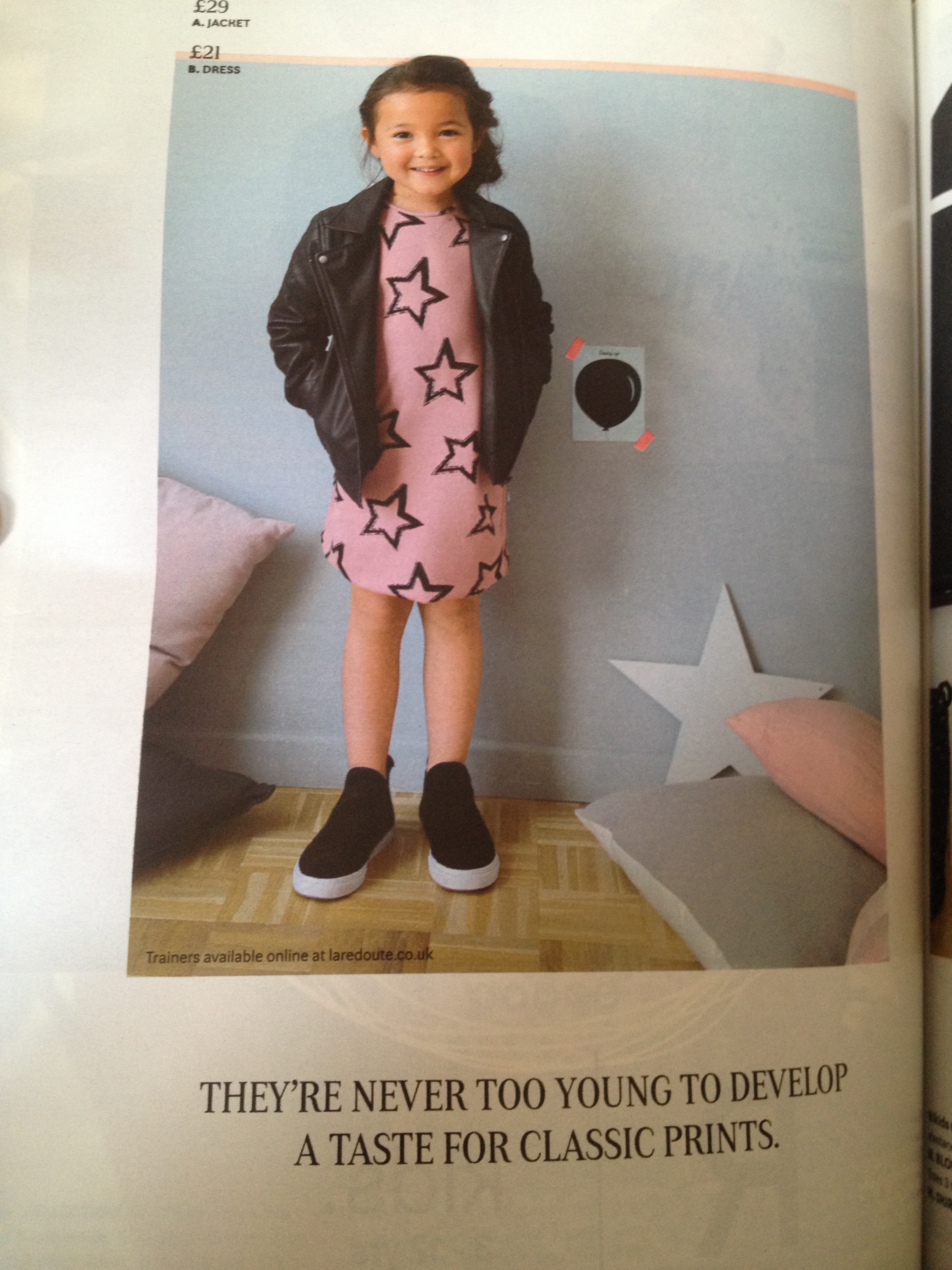 Or perhaps we did mark it in some small way, we just didn’t spend tons of cash getting ballgowns and professional hairdos and all the stuff that happens now. Which is essentially about spending money, as much as it is about marking the experience. So much in our culture now seems to be about conspicuous consumption. It doesn’t just start in school now. Following the lead of pointless and self-obsessed ‘celebrities’ such as the Kardashians and their offspring, people spend a fortune on turning their babies into miniature style icons, all the better to reflect their own status. Look at these pictures from my otherwise lovely La Redoute catalogue. This rhetoric was another thing that depressed me this week:
