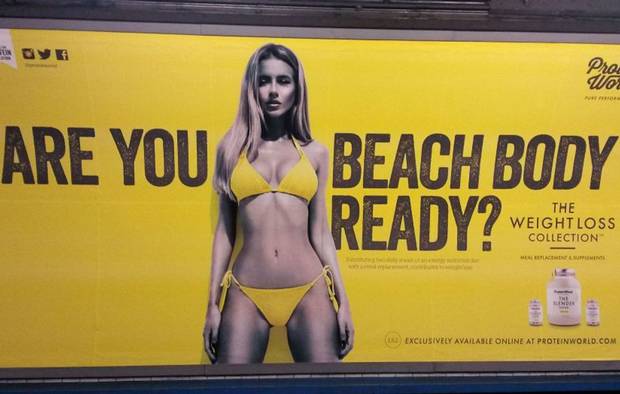 None of this stuff is anything new. Although I’m sure some men feel insecure about getting their pecs out on the beach, there is nowhere near the same level of scrutiny and body shame that there is for women. Most of it brought on by ourselves. The anti-beach body quote: ‘How to get a bikini body – put on a bikini, go to the beach’ has been floating around the internet for a while. So I was surprised by the level of outrage towards this advert on the London underground earlier this year: